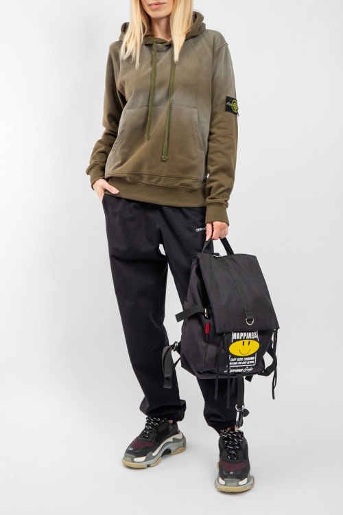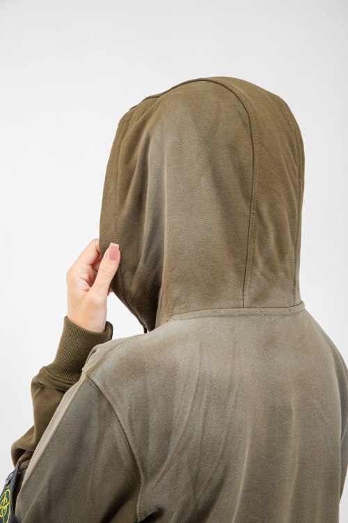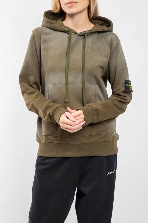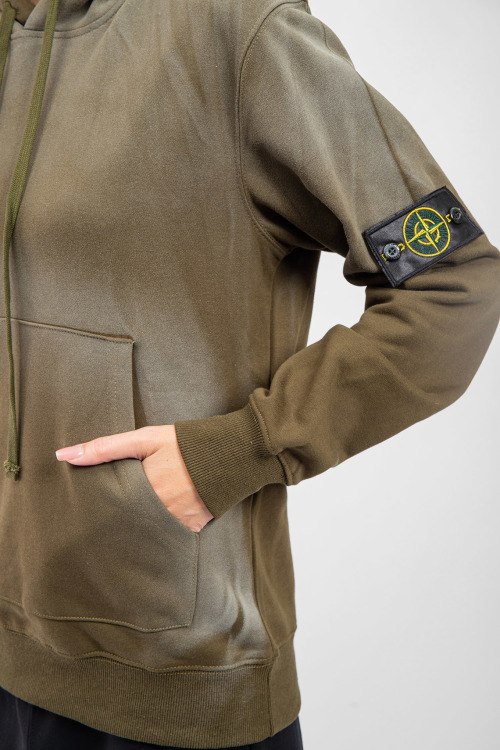 Детали: Женский худы цвета хаки из хлопка от Stone Island (Стоун Айленд). Свободный фасон, классическая длина, вшитый капюшон, карман-кенгуру, дизайн с градиентом, патч-лого на рукаве