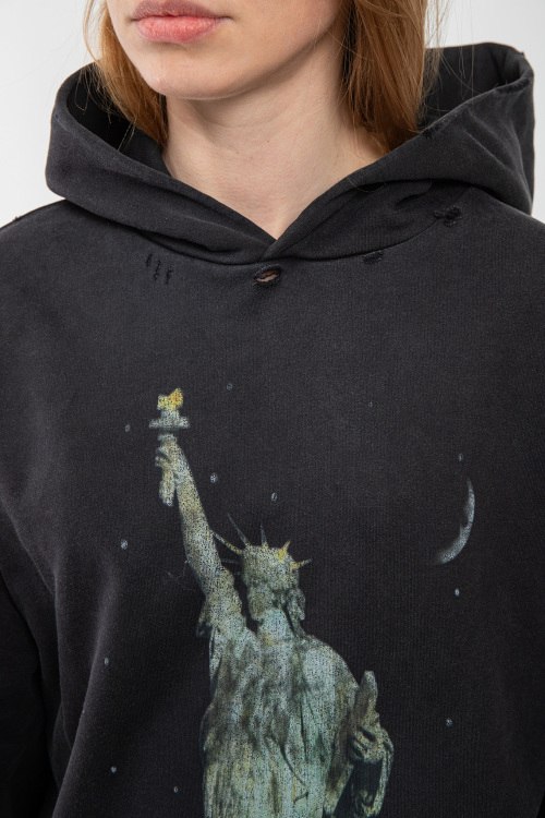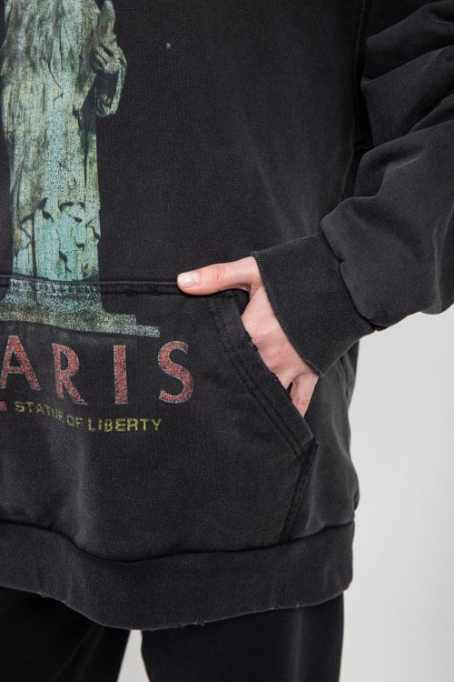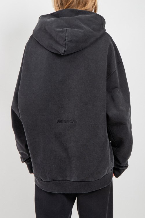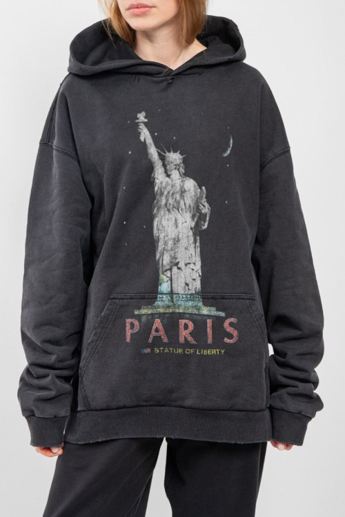 Детали: Женский темно-серый хлопковый худи Paris от Balenciaga (Баленсиага). Вшитый капюшон, принт спереди и сзади, карман-кенгуру, фасон oversize, удлиненная длина, трикотажные манжеты и нижний край