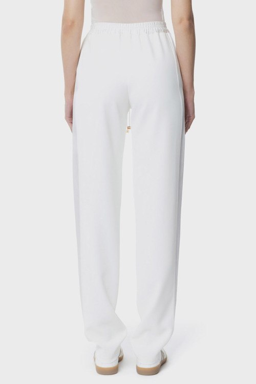 Детали: Женские белые брюки из легкой ткани от Elisabetta Franchi (Елизабетта Франчи). Эластичный пояс на завязках на концах логотипом из золотистого металла, боковые карманы, классический силуэт, полная длина