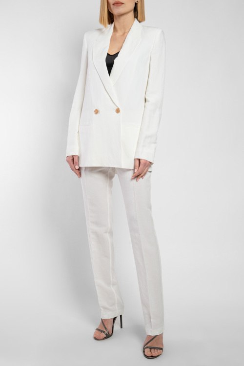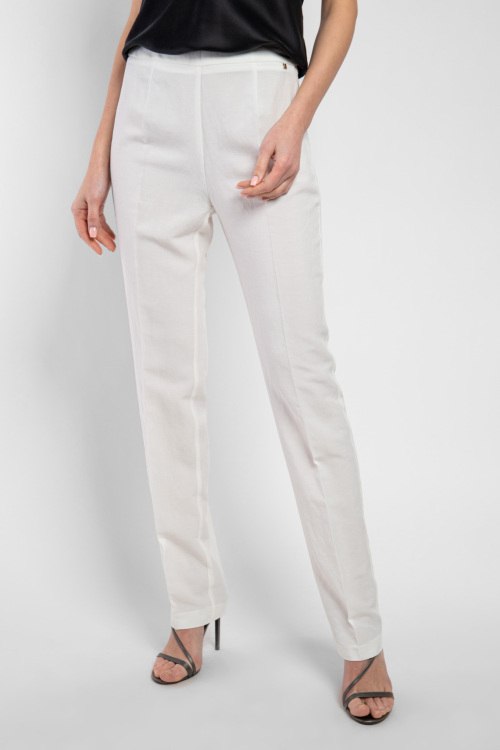 Детали: Женские белые брюки из вискозы и льна от Kocca (Кокка). Дизайн со стрелками, застежка-молния сбоку, прямой фасон, полная длина