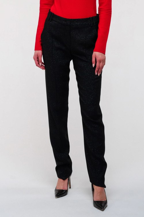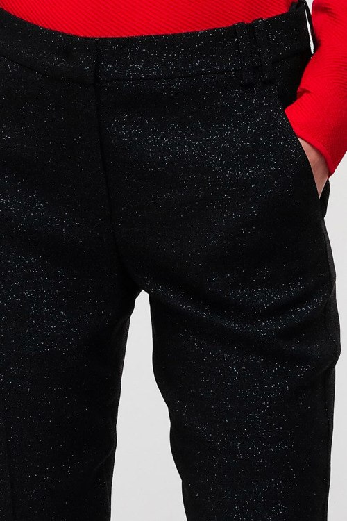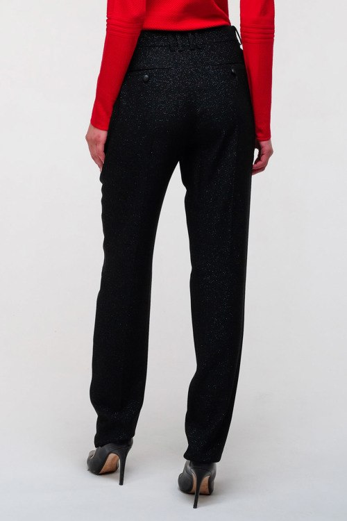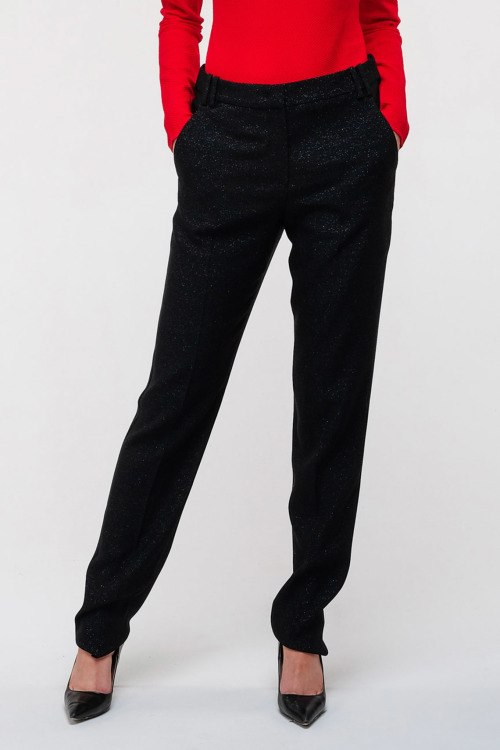 Детали: Брюки черного цвета Emporio Armani. Модель с люрексовой нитью, предающей серебристый блеск. Высокая посадка пояса, боковые карманы, петли для ремня