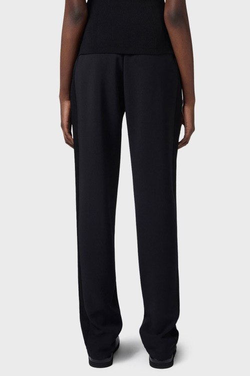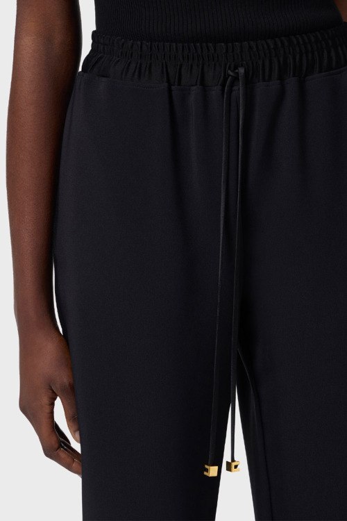 Детали: Женские черные брюки из легкой ткани от Elisabetta Franchi (Елизабетта Франчи). Эластичный пояс на завязках на концах логотипом из золотистого металла, боковые карманы, классический силуэт, полная длина