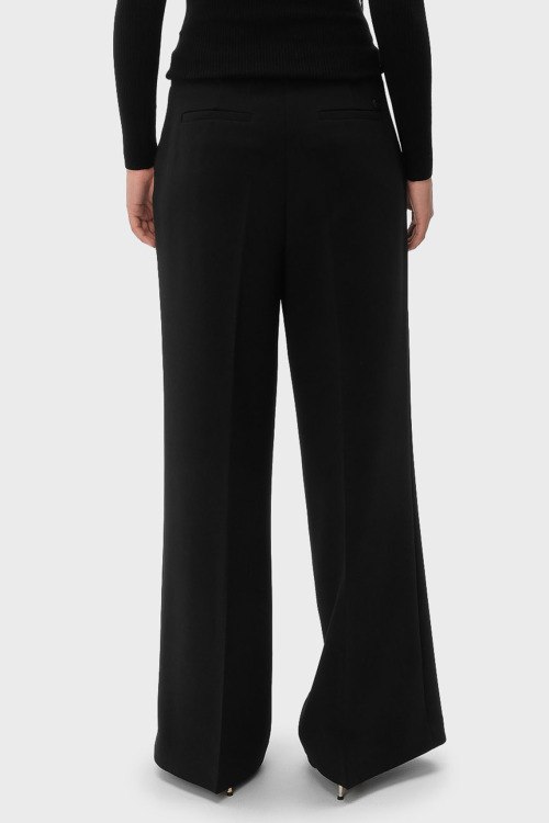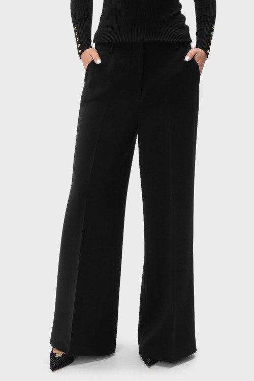 Детали: Женские черные классические брюки от Trussardi (Труссарди). Дизайн со стрелками, боковые и задние карманы, пояс с петлями для ремня, широкий крой, полная длина
