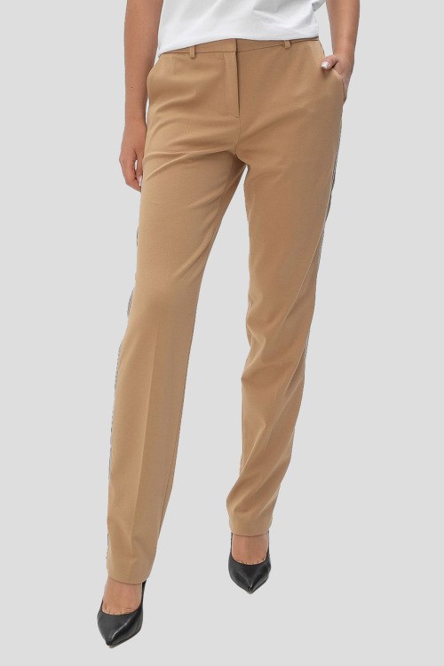 Детали: Женские трикотажные брюки цвета кэмел от Hugo Boss (Хуго Босс). Дизайн со стрелками, боковые карманы, пояс с петлями для ремня, полная длина