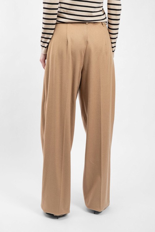 Женские шерстяные брюки цвета кэмел Paride от Max Mara Studio (Макс Мара Студио). Дизайн с защипами и стрелками, боковые карманы, в талии с поясом, полная длина.