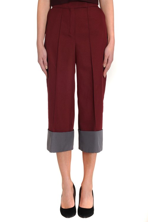 Детали: Укороченные брюки со стрелками и с высокой посадкой пояса. Брюки прямого кроя, внизу с отворотами