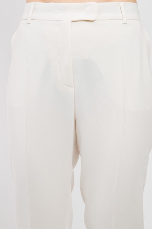 Женские брюки молочного оттенка из триацетата и полиэстера от Max Mara Studio (Макс Мара Студио). Классическая длина, высокая посадка, застежка на молнию и пуговицу, прорезные карманы, петли в поясе для ремня.