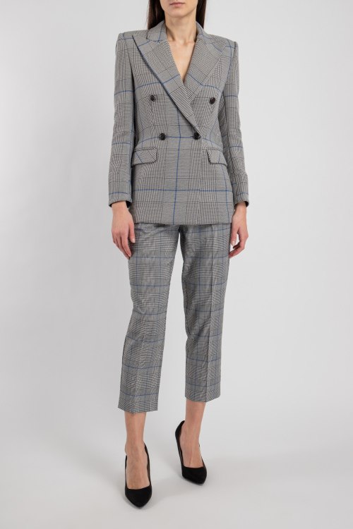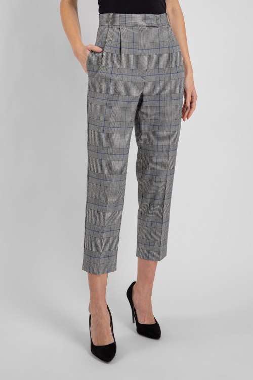 Женские серые брюки из вискозного микса от Patrizia Pepe (Патриция Пепе). Укороченная модель, дизайн в клетку, высокая посадка, застежка на молнию, пуговицу и крючок, три кармана, комбинация цветов, защипы, петли в поясе для ремня.