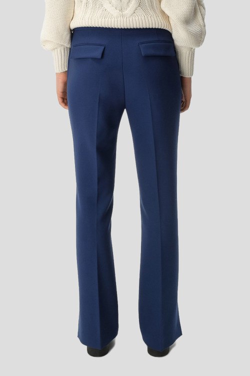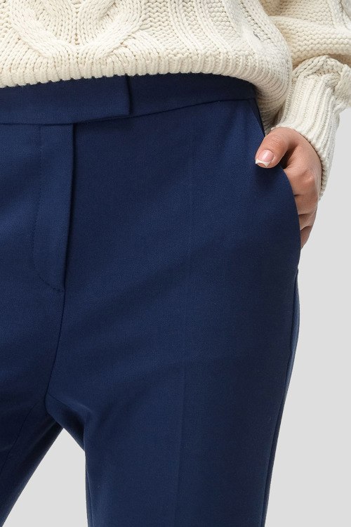 Детали: Женские темно-синие брюки из вискозного микса от Hugo Boss (Хуго Босс). Классическая длина, средняя посадка, застежка на молнию и пуговицу, прорезные карманы, два задних кармана, внизу разрезы