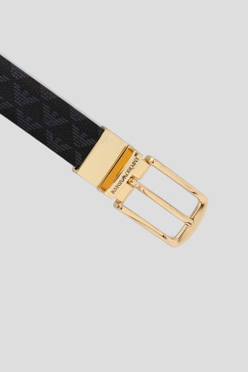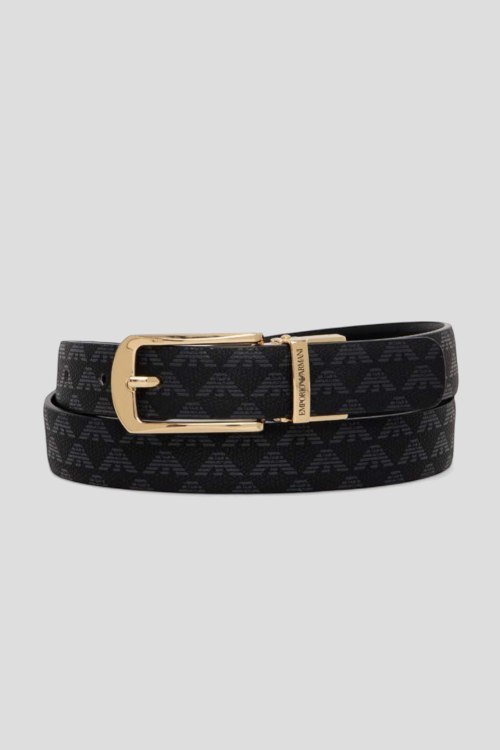 Детали: Женский черный ремень из экокожи от Emporio Armani (Эмпорио Армани). Монограмма по всей поверхности, золотистая пряжка с логотипом