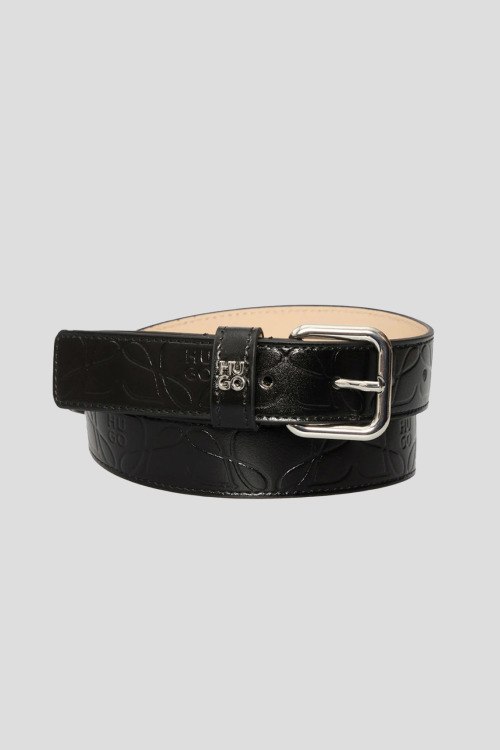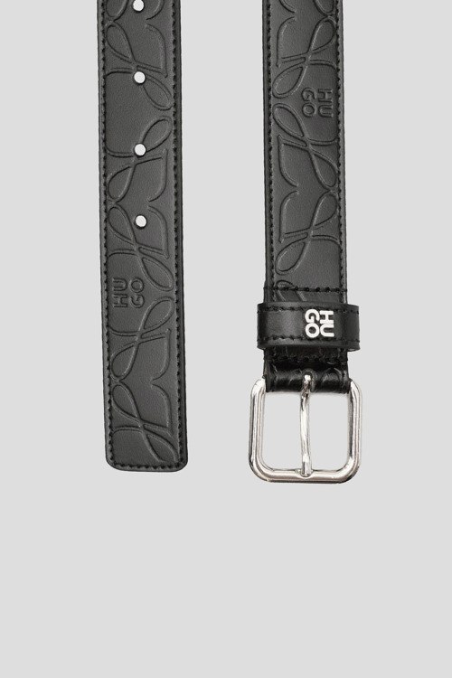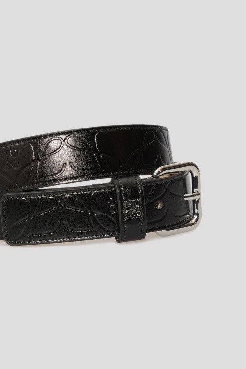 Детали: Женский черный кожаный ремень от Hugo by Hugo Boss (Хуго бай Хуго Босс). Узор по всей поверхности, тиснение с логотипом, серебристая пряжка. Ширина: 3 см