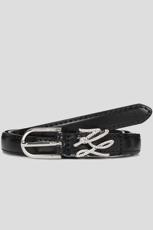 Детали: Женский черный кожаный ремень К/Аutograph от Karl Lagerfeld (Карл Лагерфельд). Модель из гладкой кожи, значок логотипа с кристаллами, металлическая пряжка. Длина ремня от начала пряжки до центрального отверстия: 75 см