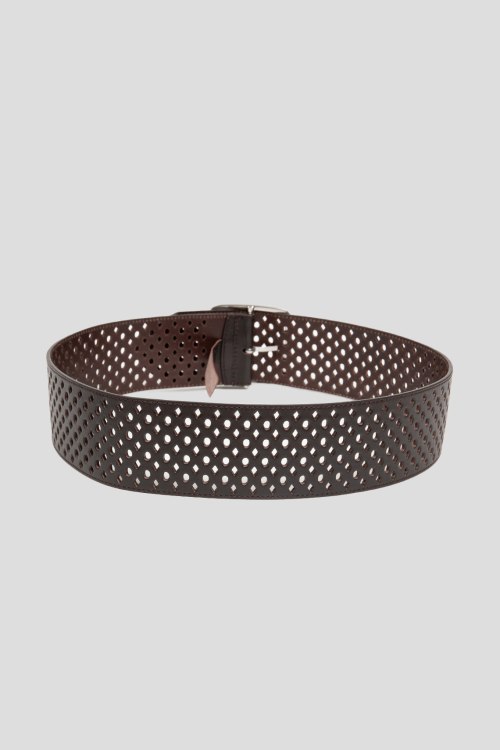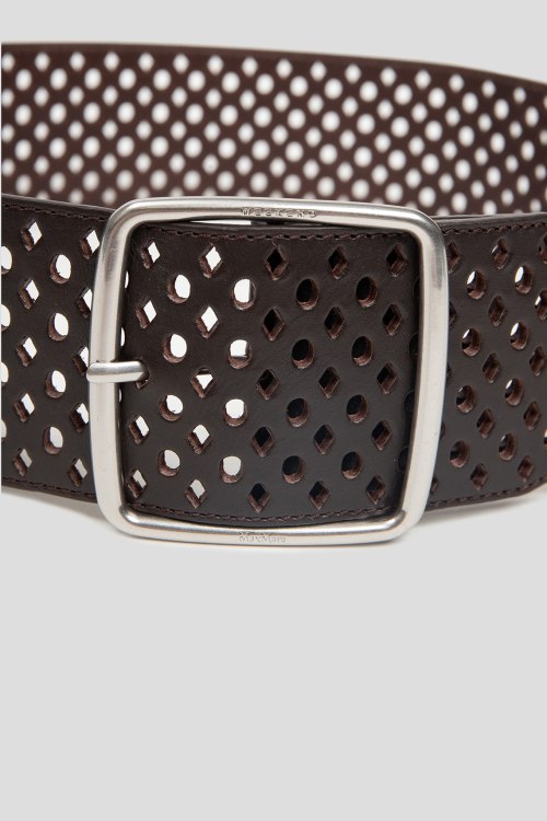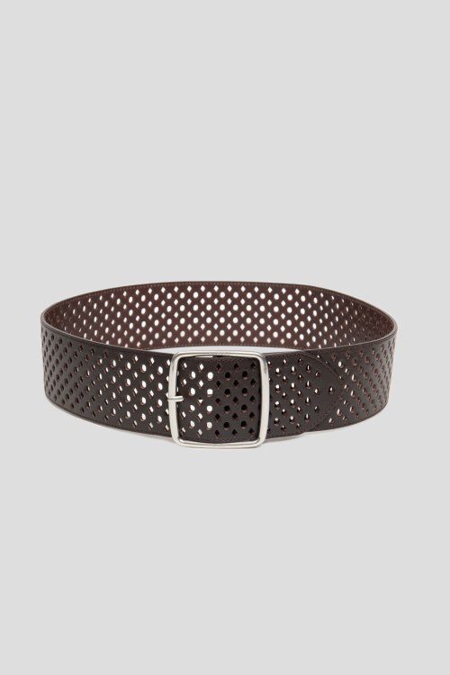 Детали: Женский темно-коричневый ремень из натуральной кожи от Max Mara Weekend (Макс Мара Викенд). Перфорированный дизайн, регулируемый размер, металлическая пряжка. Измерения: длина - 94 см, ширина - 6,5 см
