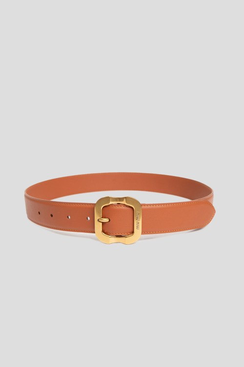 Детали: Женский карамельный кожаный ремень от Miu Miu (Миу Миу). Модель из гладкой кожи, золотистая пряжка с логотипом. Размеры: длина 98 см, ширина 3,5 см