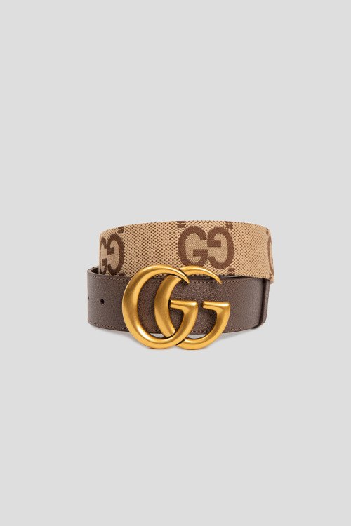 Детали: Женский коричнево-бежевый ремень из кожи и канвы GG Marmont от Gucci (Гуччи). Комбинация цветов и материалов, монограмма GG, золотистая пряжка GG. Ширина 4 см