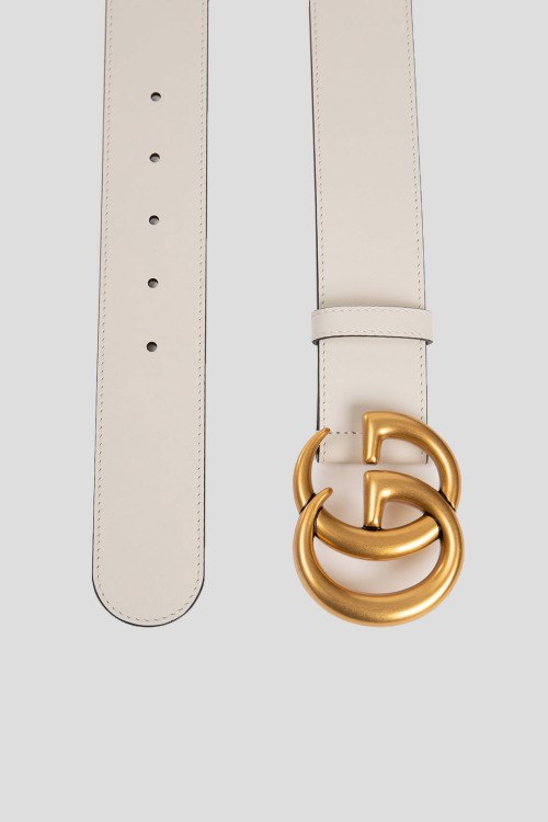 Женский кожаный ремень молочного оттенка GG Marmont от Gucci (Гуччи). Модель из гладкой кожи, золотистая пряжка с логотипом GG. Ширина - 3,5 см