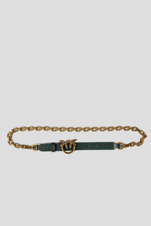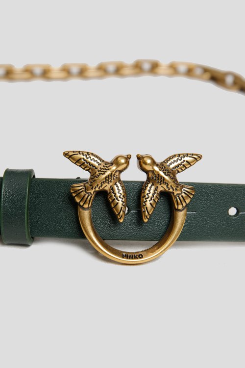 Детали: Женский темно-зеленый ремень Love Birds из натуральной кожи и металла от Pinko (Пинко). Металлическая пряжка Love Birds Diamond Cut, вставкой в виде металлической цепочки с объемными прямоугольными звеньями. Измерения: рассчитан на обхват: 74 см - 84 см (длина ремня 91 см), ширина 2 см