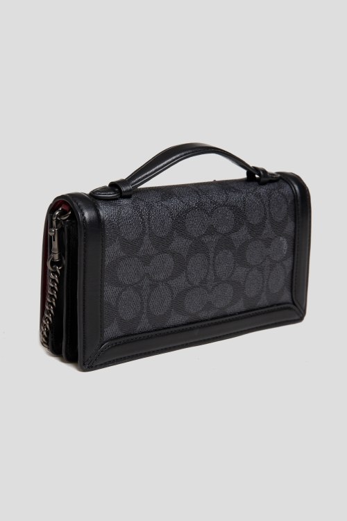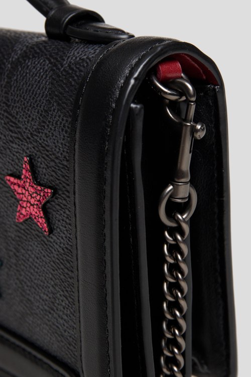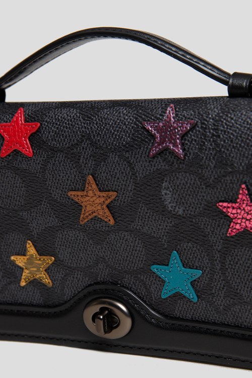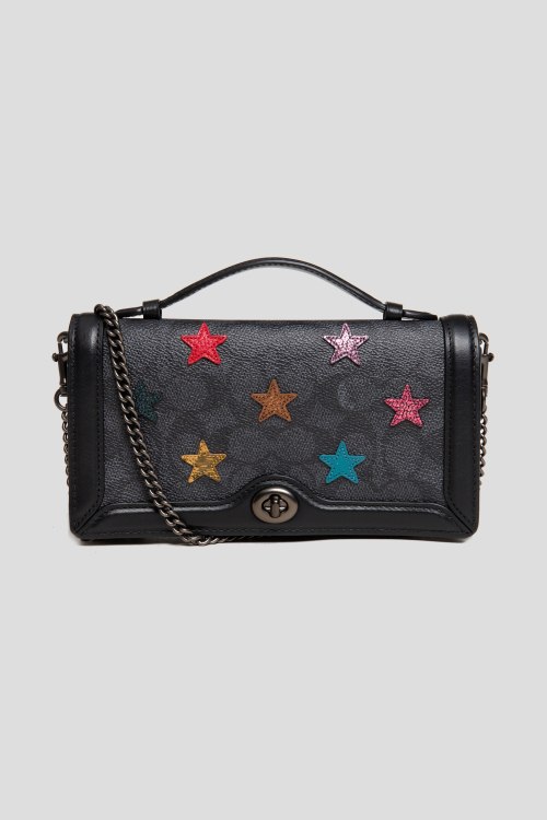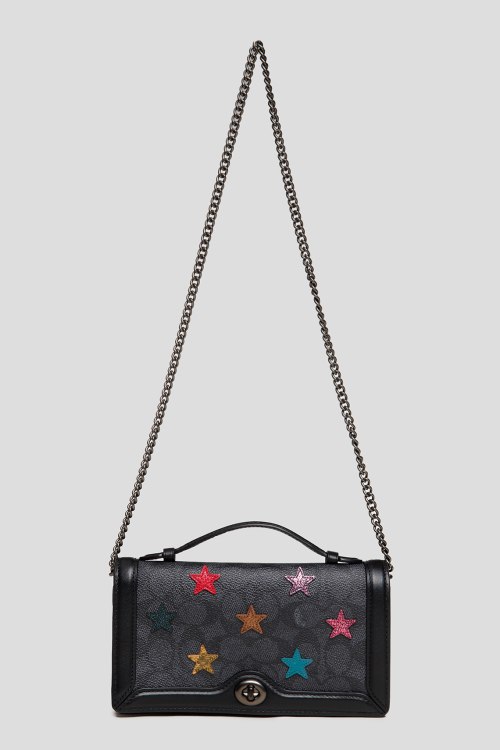Женский черный клатч Signature Canvas из натуральной кожи от Coach (Коуч). Прямоугольная форма, модель клапаном, внутренняя застежка на молнию, застежка Turnlock, тканевая подкладка, декорирован монограммой и аппликацией в виде разноцветных звезд, верхняя маленькая ручка, элегантный ремешок с цепочкой для универсального ношения. Измерения: длина сумки 20,5 см, высота 11 см, ширина 4 см.