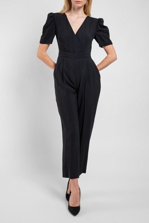 Женский черный комбинезон от MSGM (ЭмСиДжиЭм). Классическая длина, приталенный силуэт, V-образный вырез декольте, короткие объемные рукава, застежка на молнию на спине, боковые карманы.