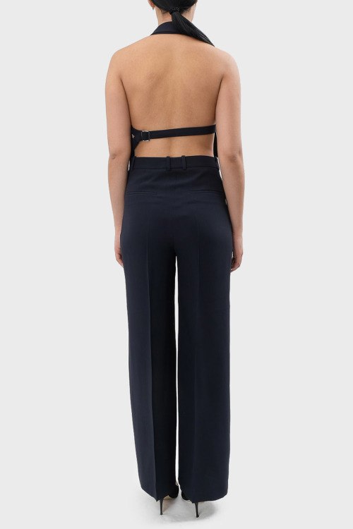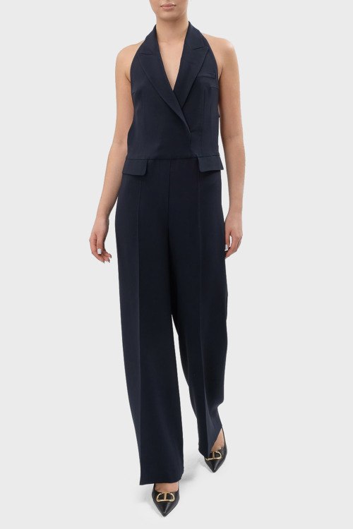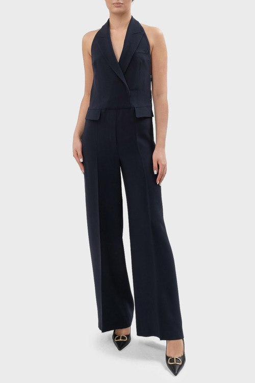 Детали: Женский темно-синий брючный комбинезон от Hugo Boss (Хуго Босс). Модель без рукавов, V-образный вырез, отложной воротник, открытая спина, широкие брюки со стрелками, полная длина