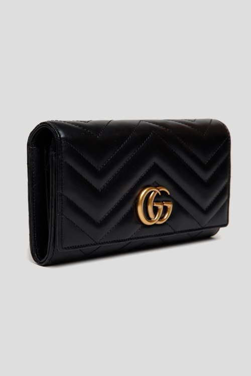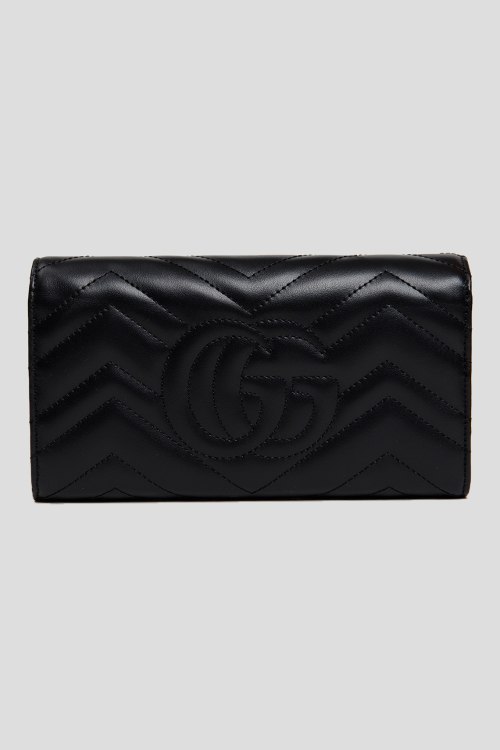 Детали: Женский черный кошелек GG Marmont continental из натуральной кожи от Gucci (Гуччи). Прямоугольная форма, тиснение с логотипом бренда, застежка на кнопуу, отделения для купюр, карман на молнии для мелочи, слоты для кредитных карт, металлический логотип бренда, в комплекте пыльник и фирменная упаковка. Измерения: 19х11х4 см