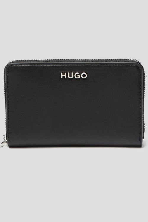 Женский черный кошелек из экокожи от Hugo by Hugo Boss (Хуго бай Хуго Босс). Модель из гладкой кожи, значок с логотипом, застежка-молния, внутренние отделения. Размеры: 10 x 16 x 2 см
