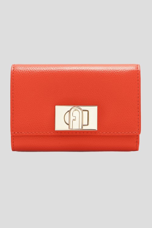 Детали: Женский оранжевый кожаный кошелек 1927 от Furla (Фурла). Модель из зернистой кожи, значок логотипа, золотистая фурнитура, застежка на защелку, карман на молнии сзади, внутренние отделения для купюр и кредитных карт. Размеры: 13 x 9 x 2 см