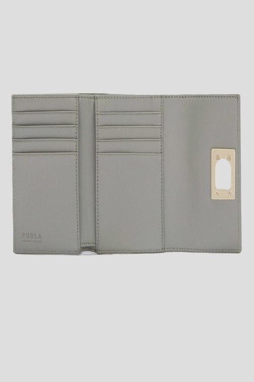 Детали: Женский серый кожаный кошелек 1927 от Furla (Фурла). Модель из зернистой кожи, золотистая фурнитура, застежка на поворотный замок, внутренние отделения для купюр и кредитных карт, карман на молнии сзади. Размер: 13 x 9.5 x 2.5 см