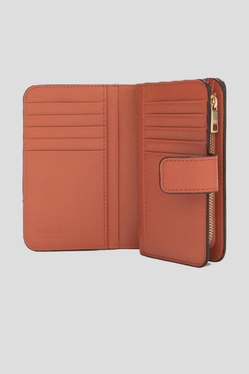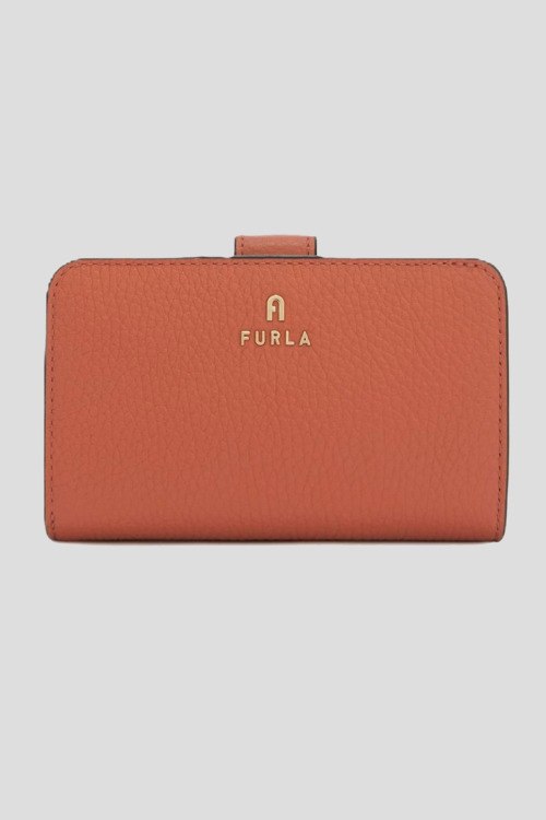 Детали: Женский терракотовый кожаный кошелек Camelia от Furla (Фурла). Модель из зернистой кожи, значок логотипа, золотистая фурнитура, застежка на кнопку, внутренние отделения для купюр, монет и кредитных карт. Размер: 14 х 9 х 3 см