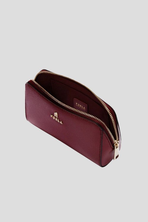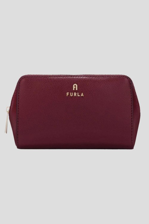 Детали: Женская бордовая кожаная косметичка Camelia от Furla (Фурла). Модель из зернистой кожи, значок логотипа, золотистая фурнитура, застежка-молния, одно отделение. Размер: 17 х 9 х 4 см