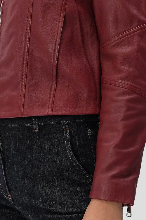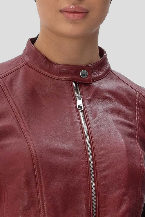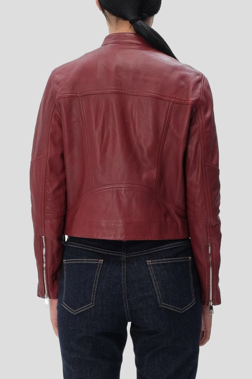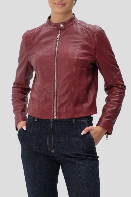 Детали: Женская бордовая кожаная куртка Saleste от Hugo Boss (Хуго Босс). Модель из гладкой кожи, воротник-стойка с застежкой на кнопку, боковые карманы, застежка-молния, рукава на молниях, короткая длина