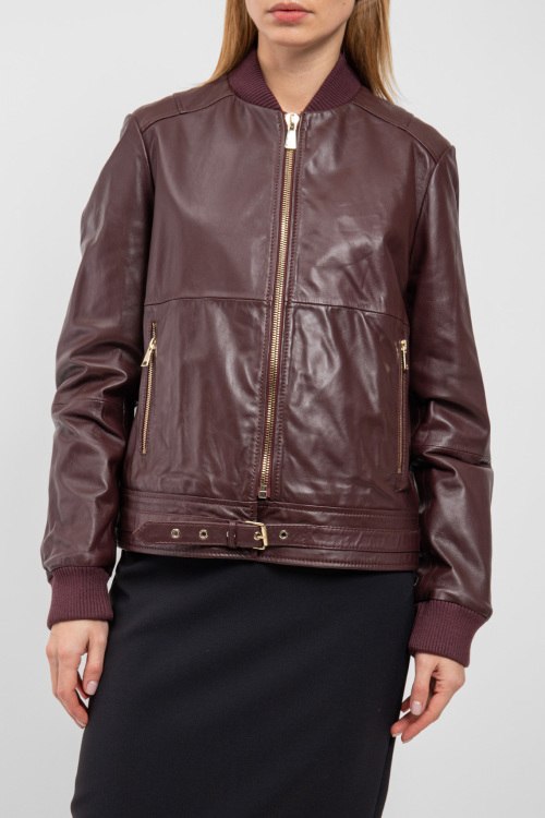 Женская бордовая куртка-бомбер из натуральной кожи от Trussardi (Труссарди). Классическая длина, застежка на молнию, боковые карманы на молнии, ремешок по низу изделия, трикотажная резинка на манжетах и по низу изделия, яркая подкладка.