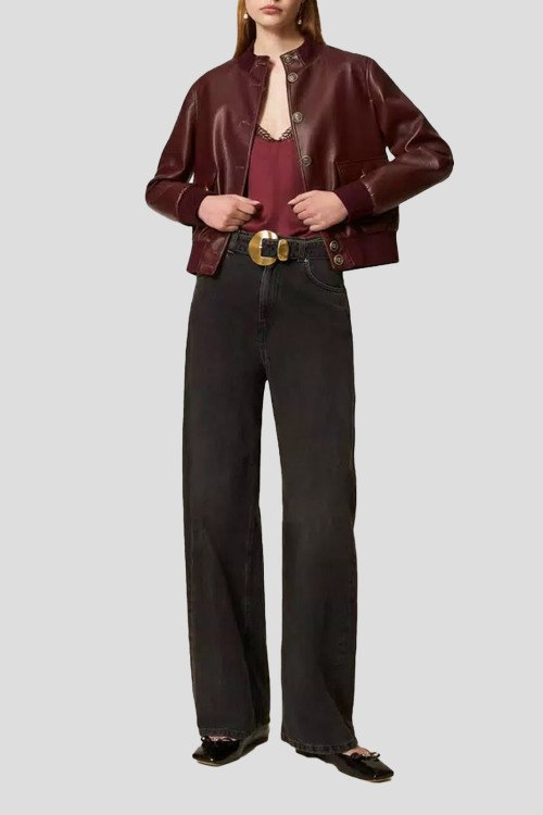 Детали: Женская бордовая куртка из экокожи от TWINSET (Твинсет). Модель из гладкой кожи, воротник-стойка, накладные карманы, застежка на золотистые пуговицы, классическая длина, трикотажные манжеты и нижний край
