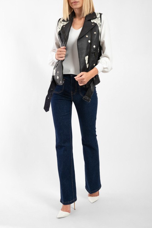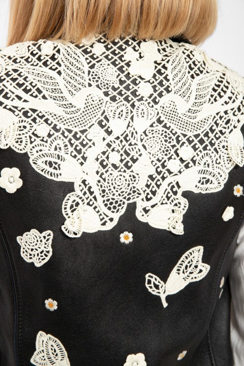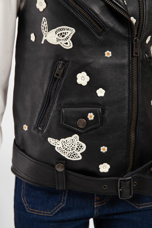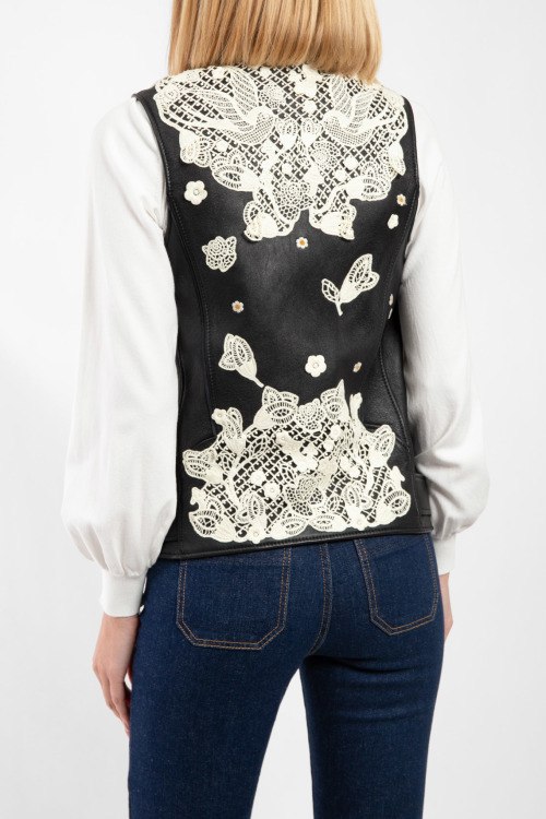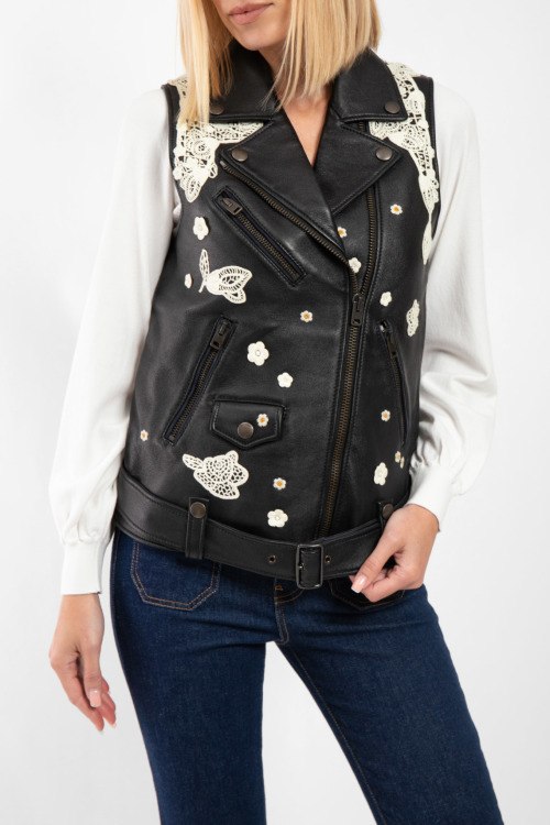 Детали: Женский черный кожаный жилет от Coach (Коуч). Белые кружевные нашивки, вышитые ромашки, отложной воротник на кнопках, три кармана на молнии, один карман на кнопке, косая застежка-молния, съемный пояс с металлической пряжкой по нижнему краю, классическая длина
