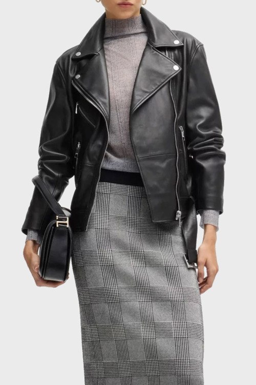 Женская черная куртка-косуха Safiyana из натуральной кожи от Hugo Boss (Хуго Босс). Отложной воротник, застежка на молнию, карманы на молнии, металлическая фурнитура серебристого цвета