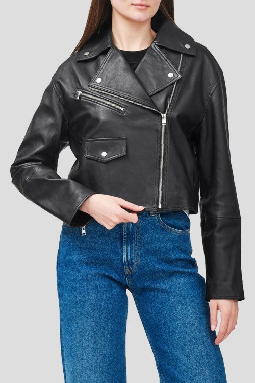 Детали: Женская черная куртка-косуха Laridas из натуральной кожи от Hugo by Hugo Boss (Хуго бай Хуго Босс). Отложной воротник, застежка на молнию, карман на молнии, металлическая фурнитура серебристого цвета, укороченная длина, манжеты на молнии