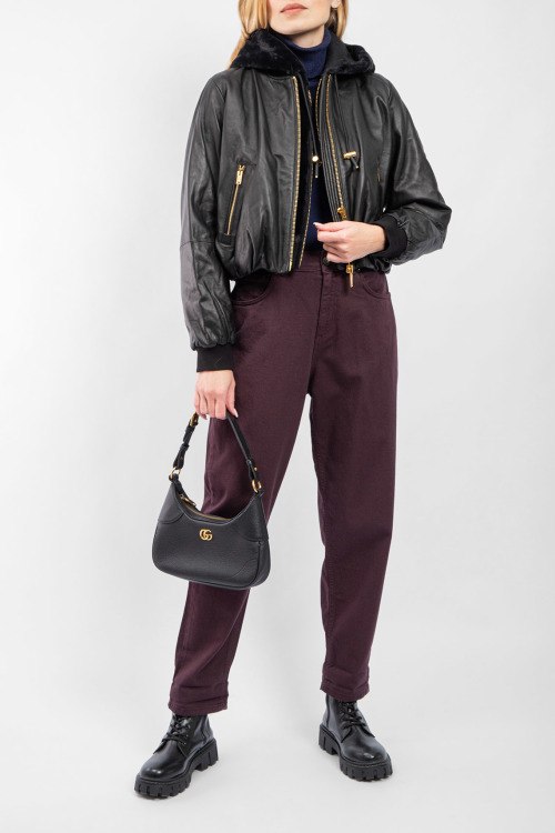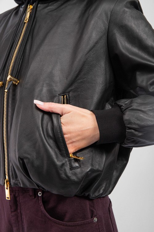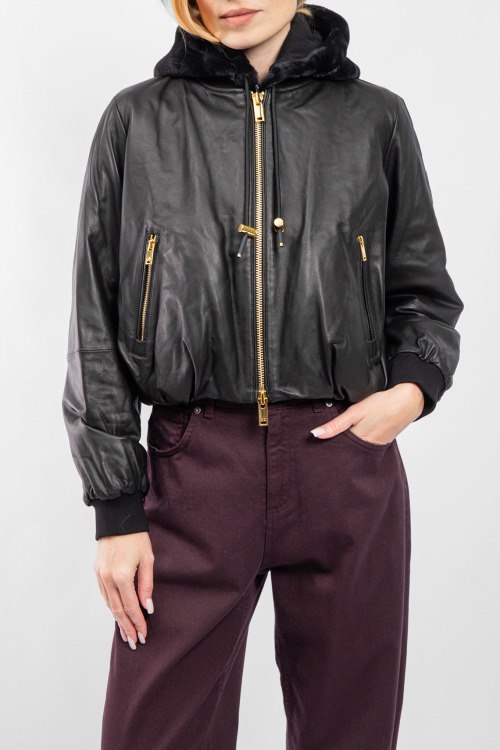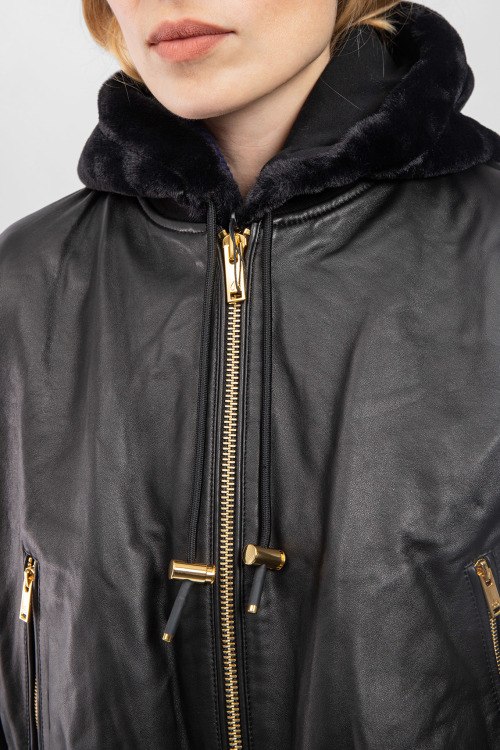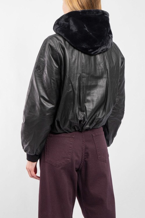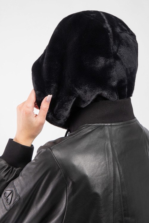 Женская черная кожаная куртка с меховым капюшоном Cardin от Moose Knuckles (Мус Наклс). Модель из гладкой кожи, съемный капюшон из экомеха, нашивка с логотипом на рукаве, воротник-стойка, боковые карманы на молнии, застежка-молния, съемная подкладка из экомеха, трикотажные манжеты, укороченная длина.