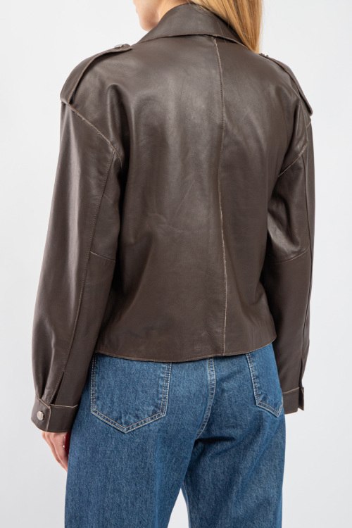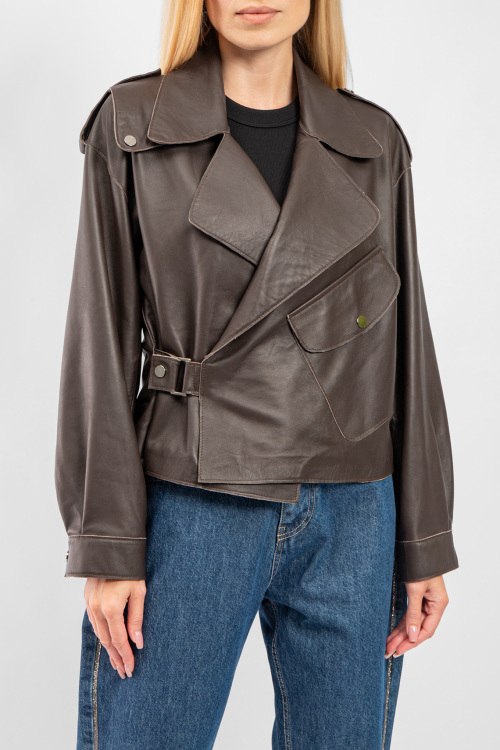 Женская темно-коричневая кожаная куртка от Clothe (Клозе). Модель из гладкой кожи, отложной воротник, накладной карман с клапаном на кнопке, застежка на кнопку, классическая длина. Размер вещи на фото: S. Замеры: длина: 54 см, ширина по груди 53 см, ширина по талии 52 см, рукав 45 см (по внутреннему шву), ширина рукава: 21 см.