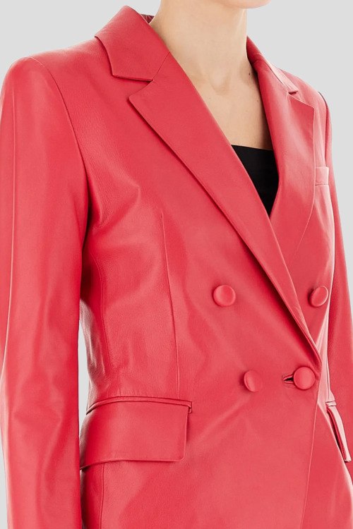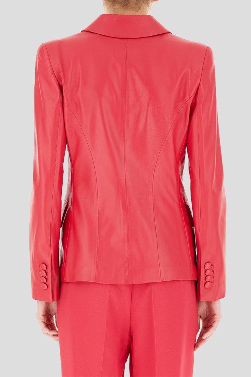 Женский малиновый жакет из натуральной кожи от Emporio Armani (Эмпорио Армани). Двубортная модель, отложной воротник, застежка на пуговицы, длинные рукава, карманы с клапаном