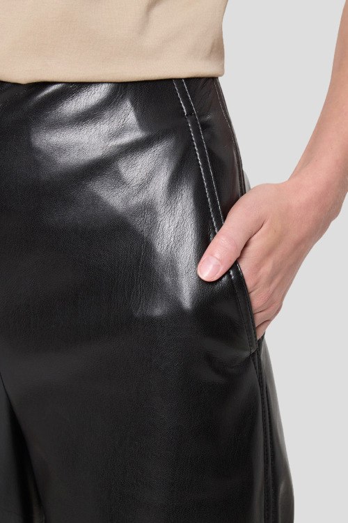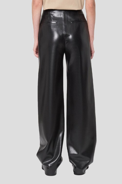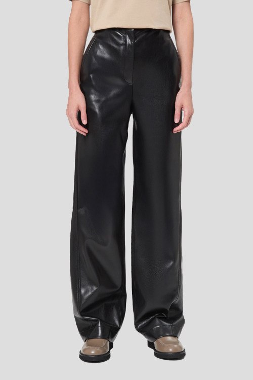 Детали: Женские черные брюки из экокожи Timiras от Hugo Boss (Хуго Босс). Модель из гладкой кожи, боковые и задние карманы, широкий крой, полная длина