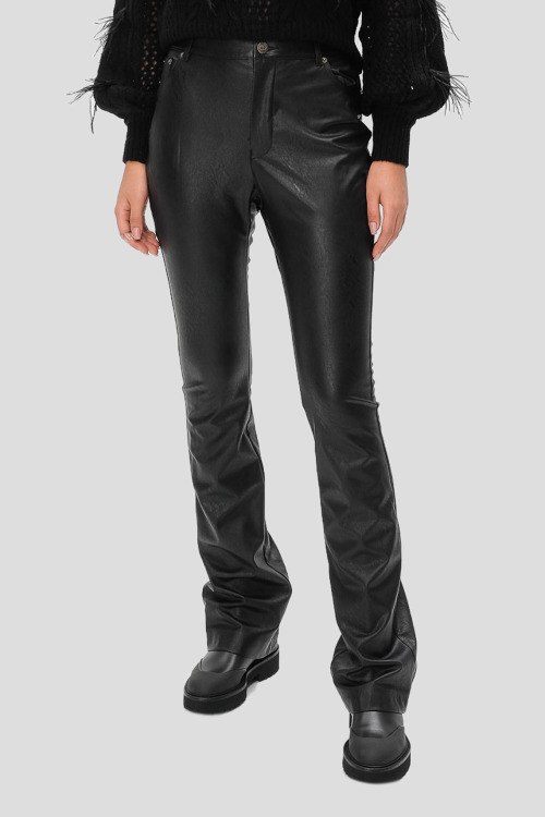 Детали: Женские черные брюки из экокожи от TWINSET (Твинсет). Пяти-карманная модель, пояс с петлями для ремня, значок с логотипом сзади на поясе, полная длина