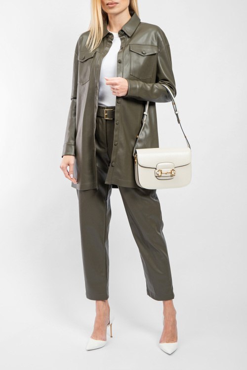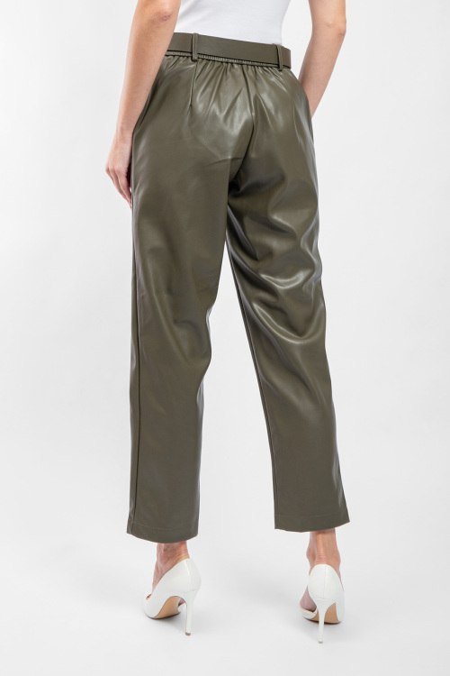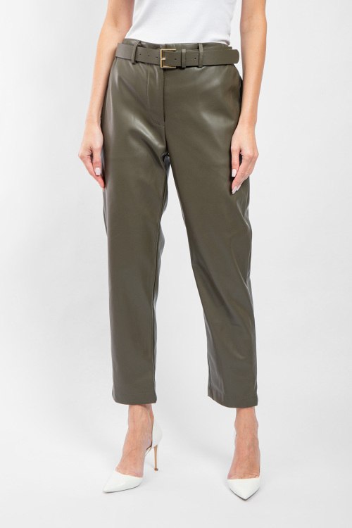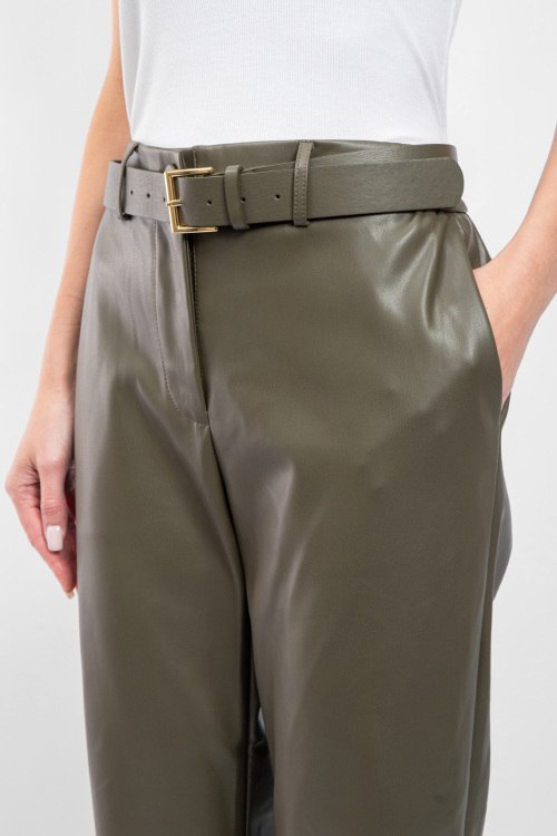 Женские брюки цвета хаки из экокожи от Kocca (Кокка). Пояс с металлической пряжкой, боковые карманы, прямой крой, укороченная длина.