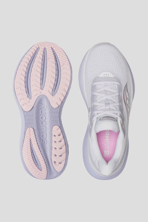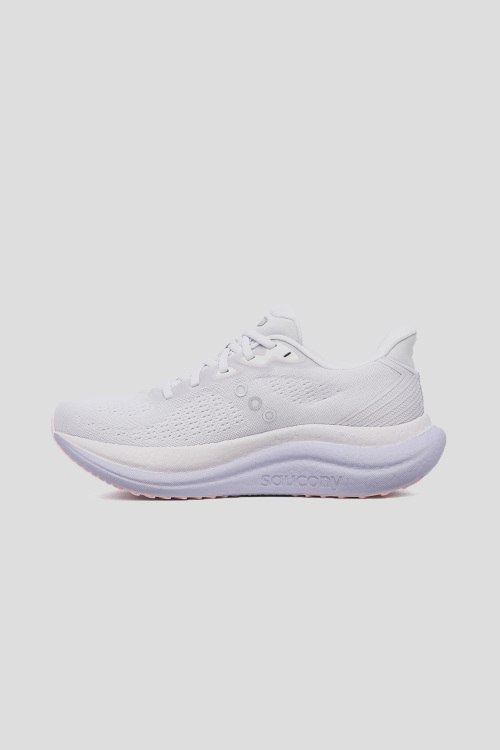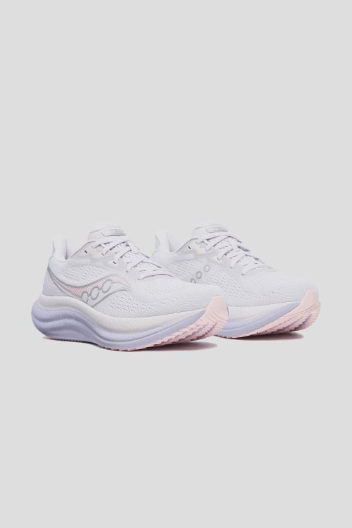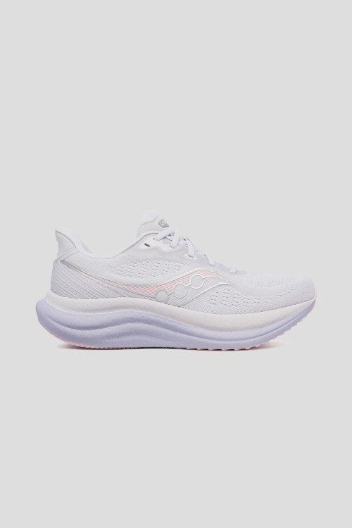 Детали: Женские белые кроссовки Triumph 23 от Saucony (Сайкони). Комбинированный дизайн, закругленный носок, спереди классическая шнуровка, логотип бренда, резиновая подошва
