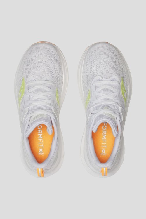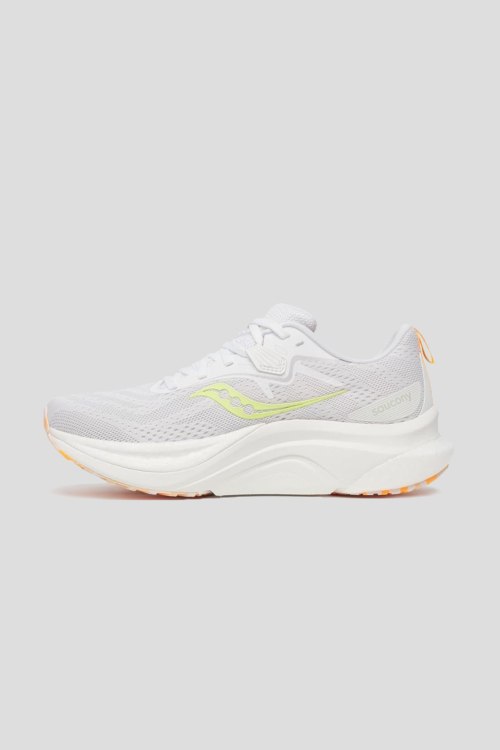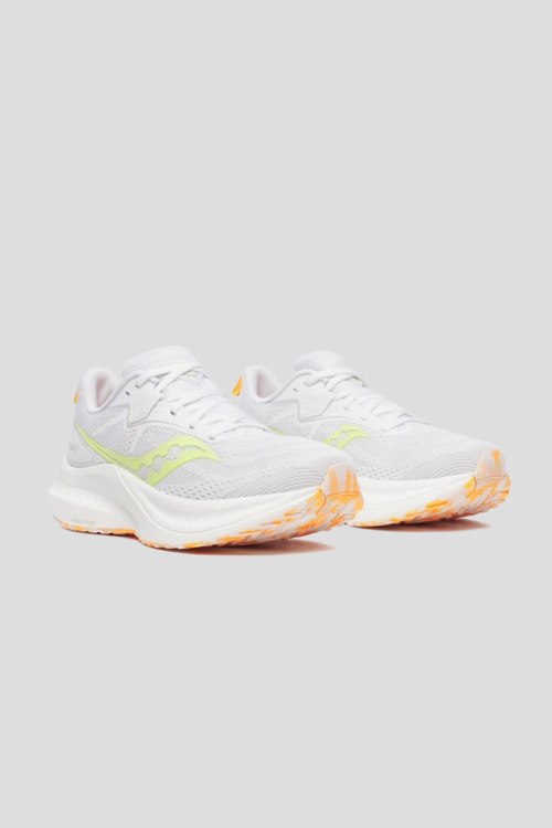 Детали: Женские белые кроссовки для бега Tempus 2 от Saucony (Сайкони). Комбинация материалов, логотип сбоку и на язычке, классическая шнуровка, закругленный носок, резиновая подошва