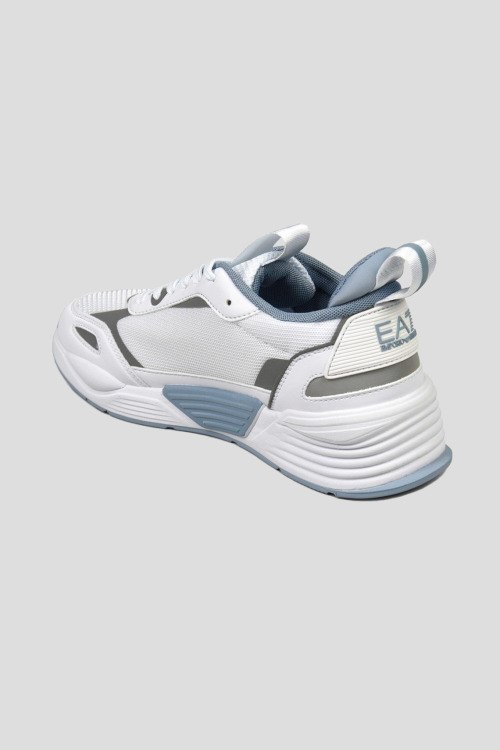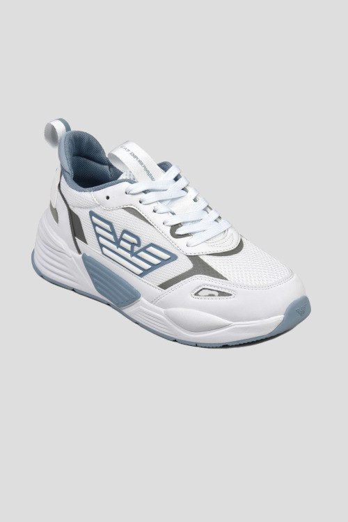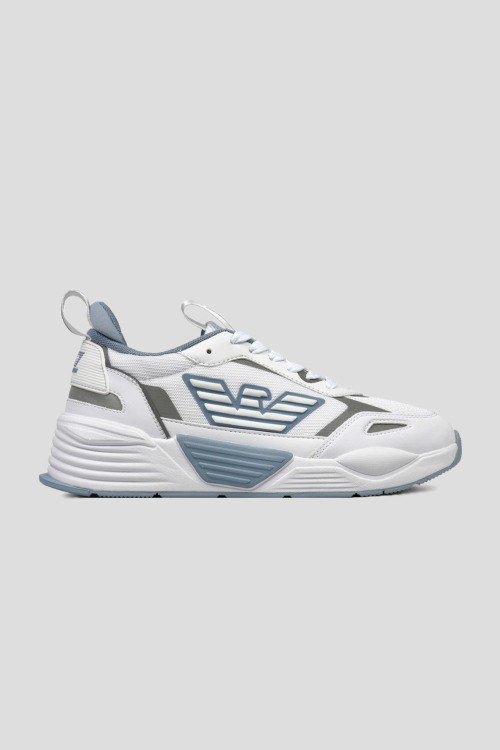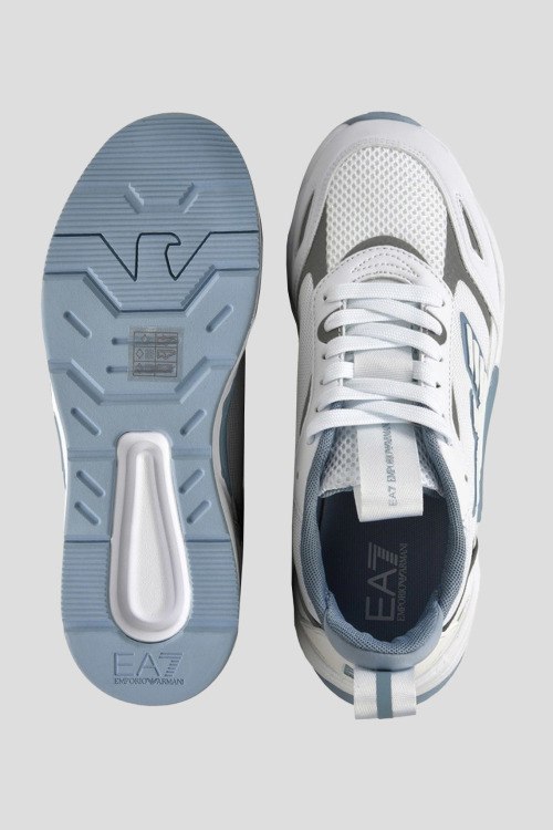 Женские белые кроссовки из экокожи и текстиля от EA7 Emporio Armani (ЕА7 Эмпорио Армани). Комбинация цветов и материалов, логотип сбоку и на язычке, классическая шнуровка, две петли для подтягивания, закругленный носок