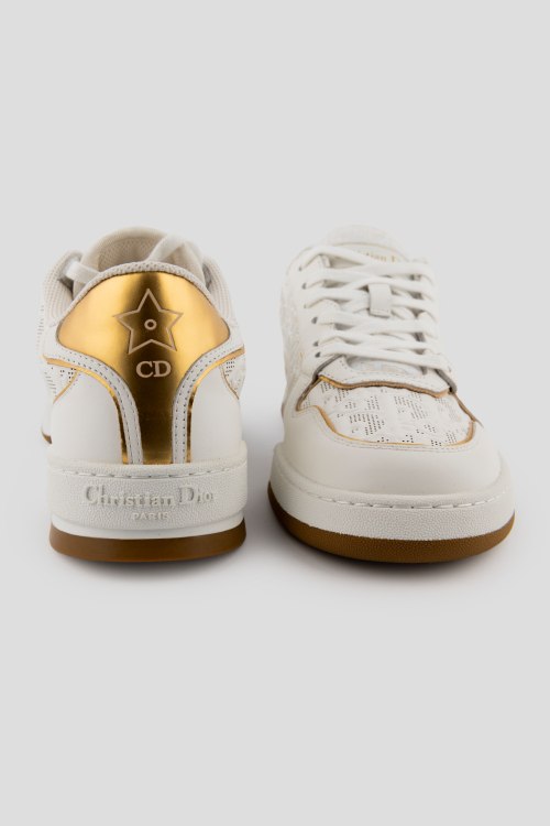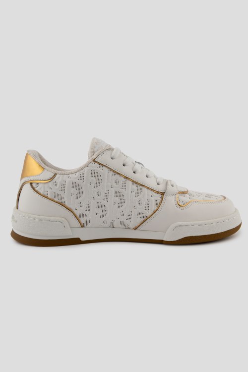 Детали: Женские белые кожаные кроссовки Dior One от Christian Dior (Кристиан Диор). Модель из гладкой перфорированной кожи, логотип по всей поверхности и на язычке, классическая шнуровка, золотистые вставки, закругленный носок