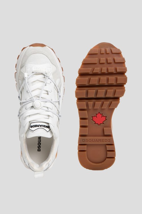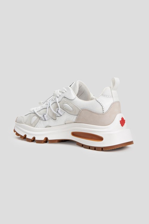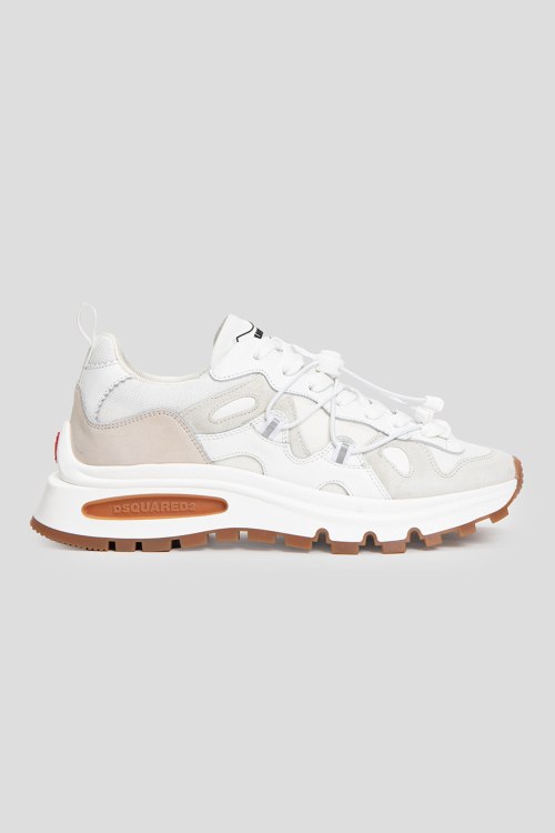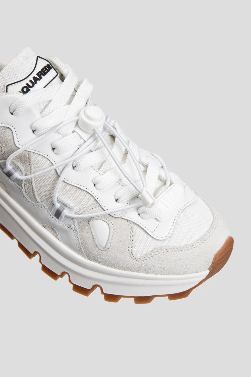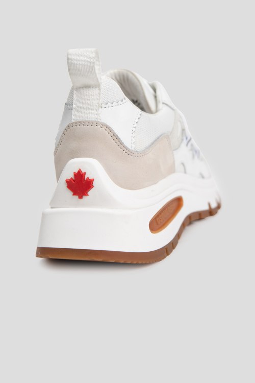 Детали: Женские белые кроссовки из кожи и текстиля от Dsquared2 (Дискваред). Комбинация материалов, замшевые вставки, логотип на язычке и на подошве, классическая шнуровка, петля для подтягивания сзади, закругленный носок