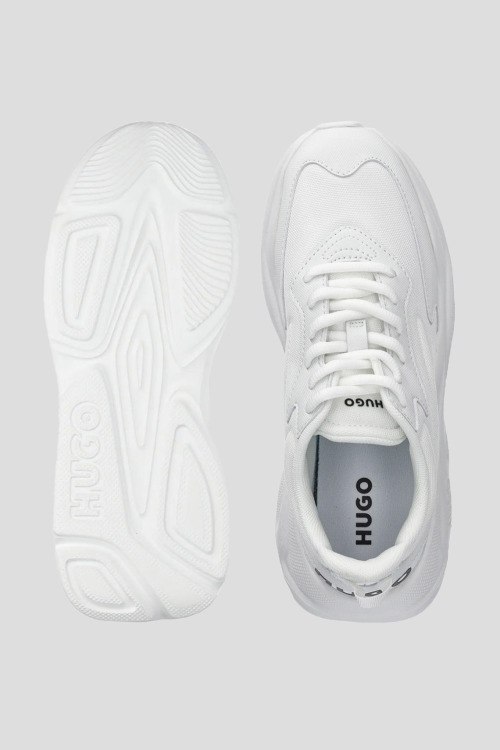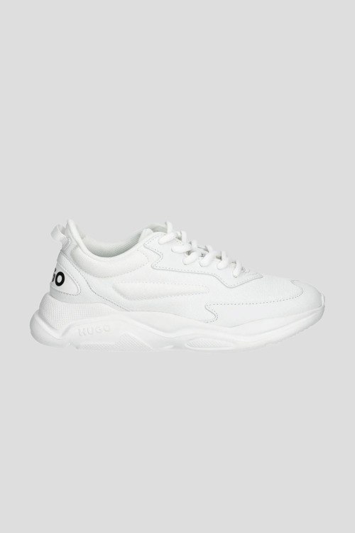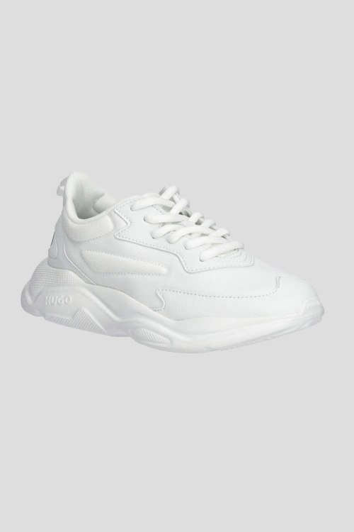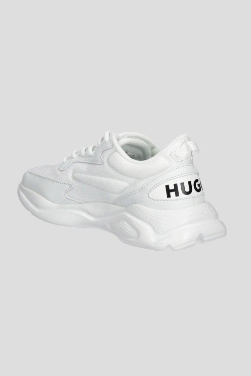 Детали: Женские белые текстильные кроссовки Leon от Hugo Boss (Хуго Босс). Логотип на язычке и на пятке, классическая шнуровка, петля для подтягивания сзади, закругленный носок