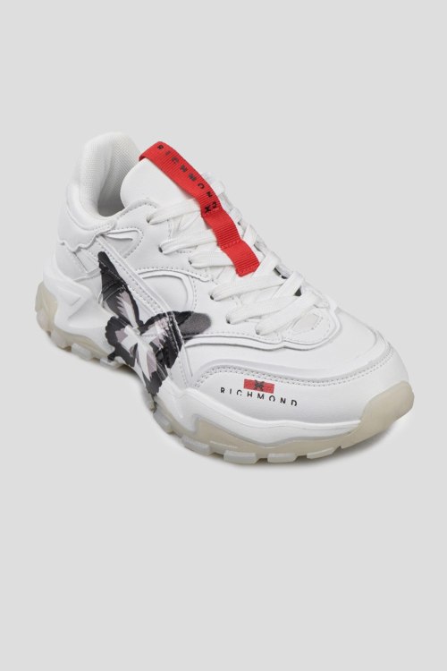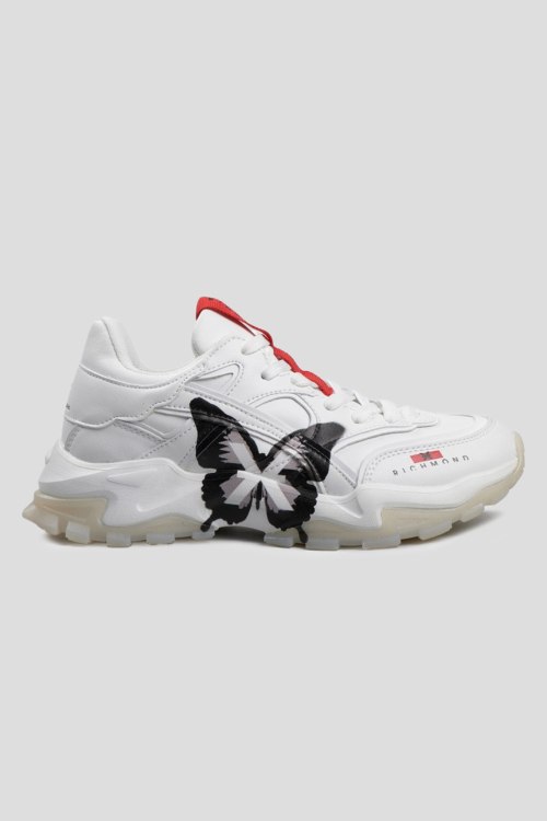 Детали: Женские белые кожаные кроссовки от John Richmond (Джон Ричмонд). Модель из гладкой кожи, принт бабочки, принт с логотипом, классическая шнуровка, закругленный носок, кожаная стелька
