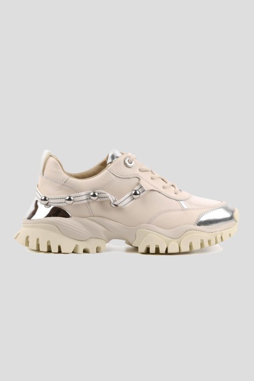 Детали: Женские кроссовки молочного оттенка из натуральной кожи от Le Berdes (Ле Бердес). Дизайн в виде комбинации и цветов и материалов, миндалевидный носок, спереди классическая шнуровка, по бокам декорированы заклепками, петли для подтягивания, массивная рельефная подошва с серебристой вставкой сзади